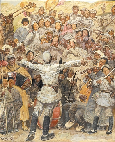 沈尧伊油画《在太行山上》,创作于2008年。2022年至2025年,作者创作了第二幅作品。作品创意来源于同名抗战歌曲。作者以低饱和度的暖褐色为主调,进行历史和美学意义上的提纯,又以恣意纵横的笔触、富有动感的光色,描绘了军民共奏欢歌的动人场景。温暖的光晕照亮了人们的衣襟和面容,充盈着一种苦难中的生命活力,传递着蕴藏在太行深处的精神基因——崇高的革命信仰支撑着、军民鱼水情深滋养着的革命乐观主义精神。