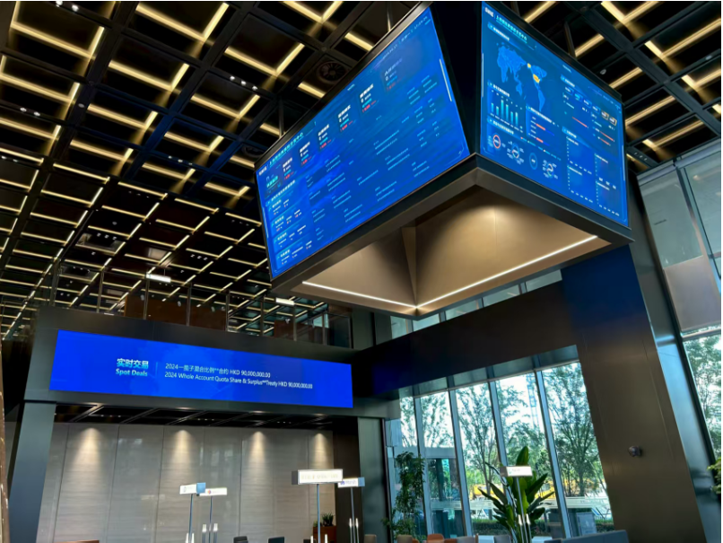走进这座位于滴水湖北岸的玻璃幕墙大楼,现代化的交易场景令人眼前一亮。一楼交易大厅顶部,电子大屏实时滚动全球交易数据;二楼交易席位上,“红马甲”交易员们正忙碌操作。当某机构有分保需求时,交易员会点亮席位上的灯,吸引有意承接风险的机构前来洽谈。