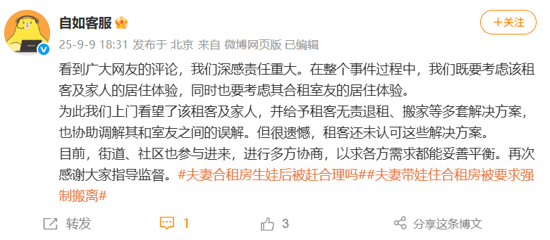自如客服官微9日消息,“看到广大网友的评论,我们深感责任重大。在整个事件过程中,我们既要考虑该租客及家人的居住体验,同时也要考虑其合租室友的居住体验。