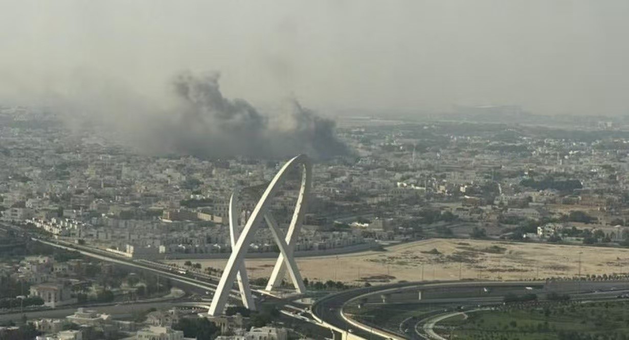 9日,多哈北部的袭击现场,浓烟四起。