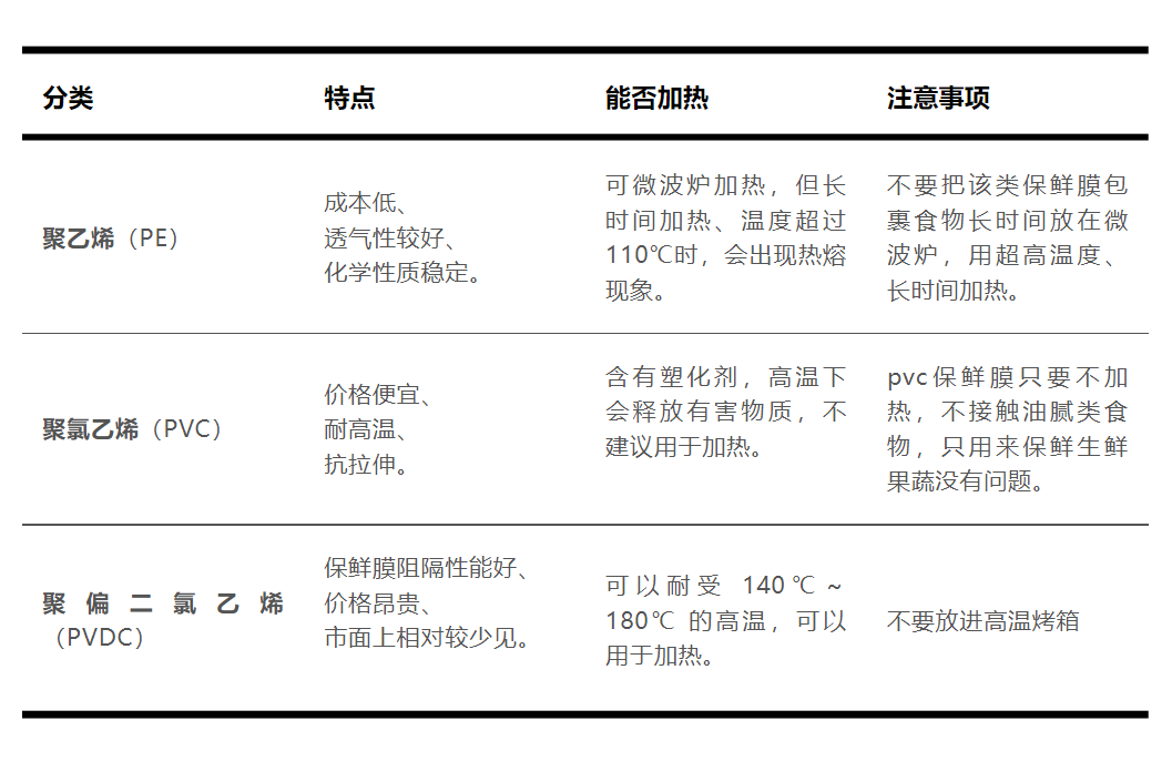 市面上常见的食品级保鲜膜材质主要有聚乙烯(PE)、聚氯乙烯(PVC)、聚偏二氯乙烯(PVDC)和其他生物降解材料。我们总结了材质特点和使用注意事项↓
