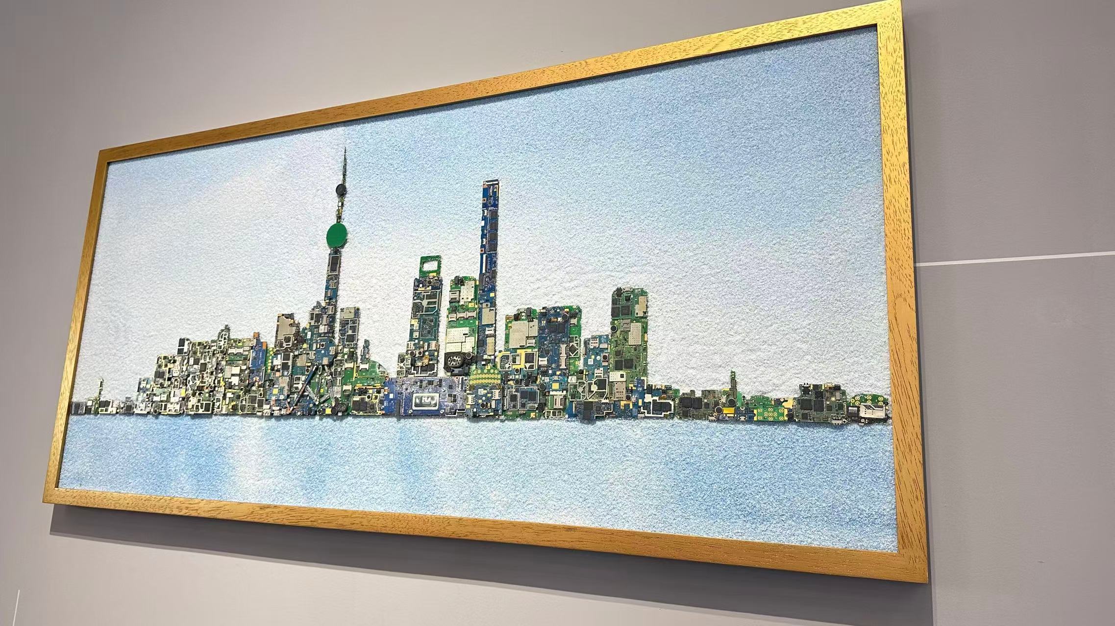 华勤用主板零件拼出的上海陆家嘴地标画。王崟欣摄