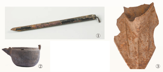 图①②③分别为红石砬子抗日根据地遗址出土的杨靖宇将军的毛笔、战士们使用过的陶药罐、铁铧。(以上图片均为孟庆旭提供)