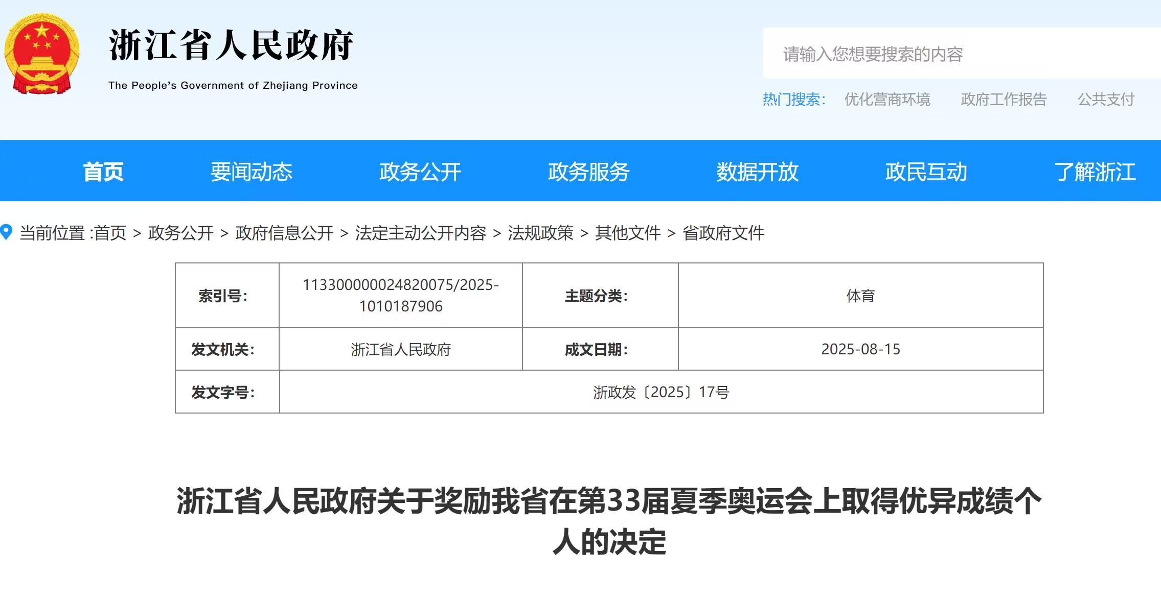 9月12日,浙江省人民政府网站发布《关于奖励我省在第33届夏季奥运会上取得优异成绩个人的决定》。