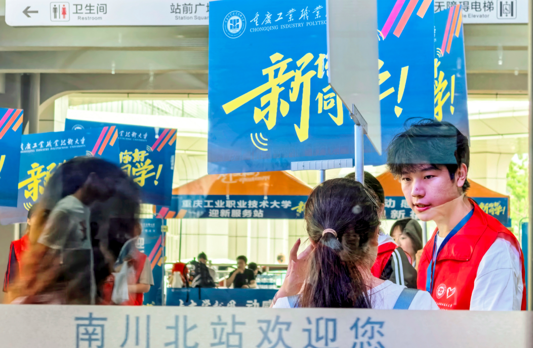 重庆工业职业技术大学南川校区的志愿者南川北站迎接新生。甘昊旻摄