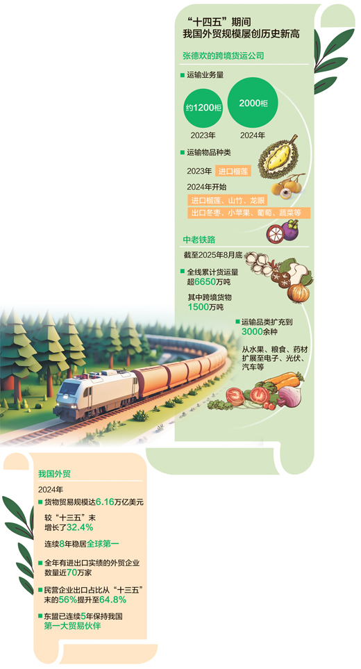 “中老铁路冷链运输榴莲更靠谱”,很快传遍了云南榴莲贸易圈。张德欢的公司忙起来了,与此同时,2023年中老铁路进出口货运量421.77万吨,同比增长近95%。