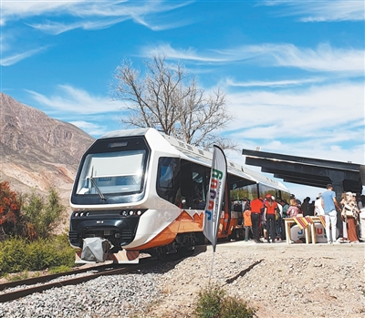 作品简介:2023年12月7日,阿根廷胡胡伊新能源轻轨列车首发仪式在胡胡伊省火山火车站举行,引发阿根廷全国瞩目。这是中国首次向海外出口新能源轻轨列车。列车在胡胡伊省贝尔格拉诺C线支线城际客运米轨铁路上投入运营,线路约35公里,主要服务于著名世界文化遗产——乌马瓦卡山谷景区。本组图片清晰呈现列车外观设计中采用的大量乌马瓦卡山谷元素,以白色主基调和橙色山脉线条拼接的车体为拍摄焦点,配以花纹天花板、红色座椅、超广角观景窗装饰等细节,生动呈现列车与当地自然景观融为一体的绿色环保设计思路。