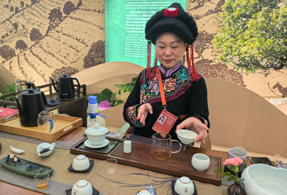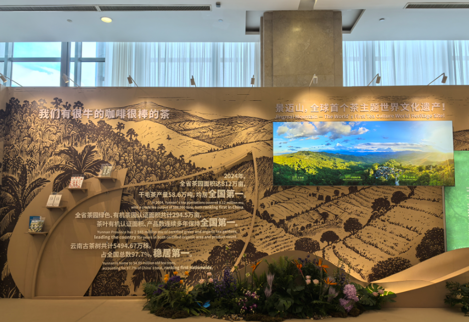 云茶展区还重点展示了“普洱景迈山古茶林文化景观”项目。2023年9月17日,中国“普洱景迈山古茶林文化景观”项目被列入《世界遗产名录》。“普洱景迈山古茶林文化景观”由5片古茶林、9个古村寨以及3片分隔防护林共同构成,至今仍保持着蓬勃生命力,是迄今为止发现的面积最大、保存最完整、年代最久远的人工栽培型古茶林,是中国农耕文明的智慧结晶,也是人与自然良性互动和可持续发展的典范,彰显了中国在世界茶叶起源、种植、贸易和茶文化传播领域的主导地位。