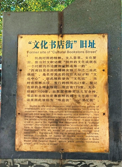 位于桂林市中心的解放西街,一座“文化书店街”旧址纪念碑在街角静静矗立。抗战时期,这条街道曾有过另一个名字:桂西路。