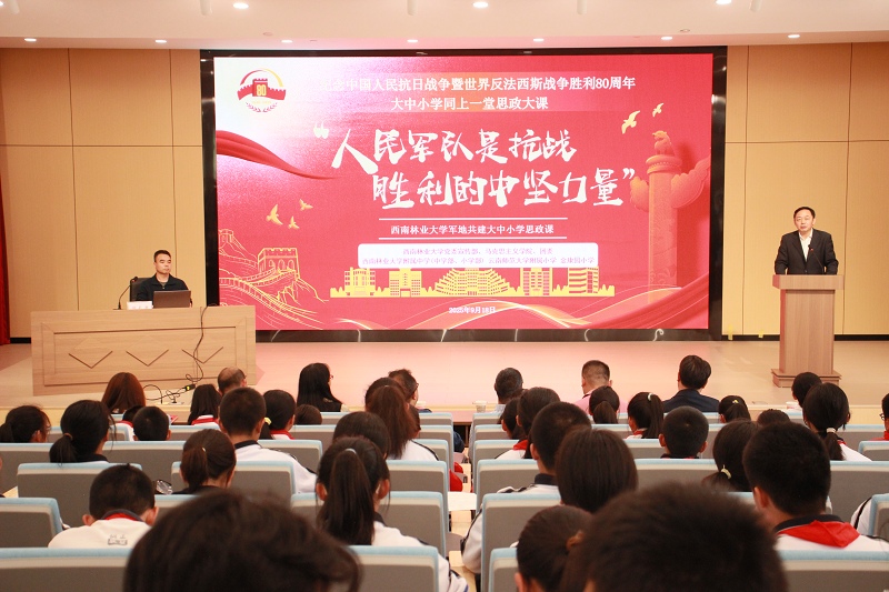为纪念中国人民抗日战争暨世界反法西斯战争胜利80周年,9月18日上午,西南林业大学举办了一场“大中小学同上一堂思政大课”活动。来自西南林业大学及其附属中学(中学部、小学部)、云南师范大学附属小学、金康园小学等校的200余名师生代表,齐聚西南林业大学报告厅,共同缅怀先烈,铭记那段波澜壮阔的历史。