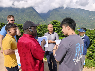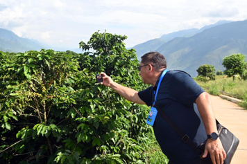 何文俊带领采风团缓步向前,讲述咖啡从种植到收获的过程。中外记者专注聆听着,不时俯身观察咖啡树的细节,眼中满是好奇与赞叹。庄园内目之所及,远处是群山叠嶂,流云环抱;近处是丛丛咖啡果树,翠绿枝叶间可见累累果实。景色宜人,引得中外记者不时驻足观赏,与眼前的秀美风光频频合影。