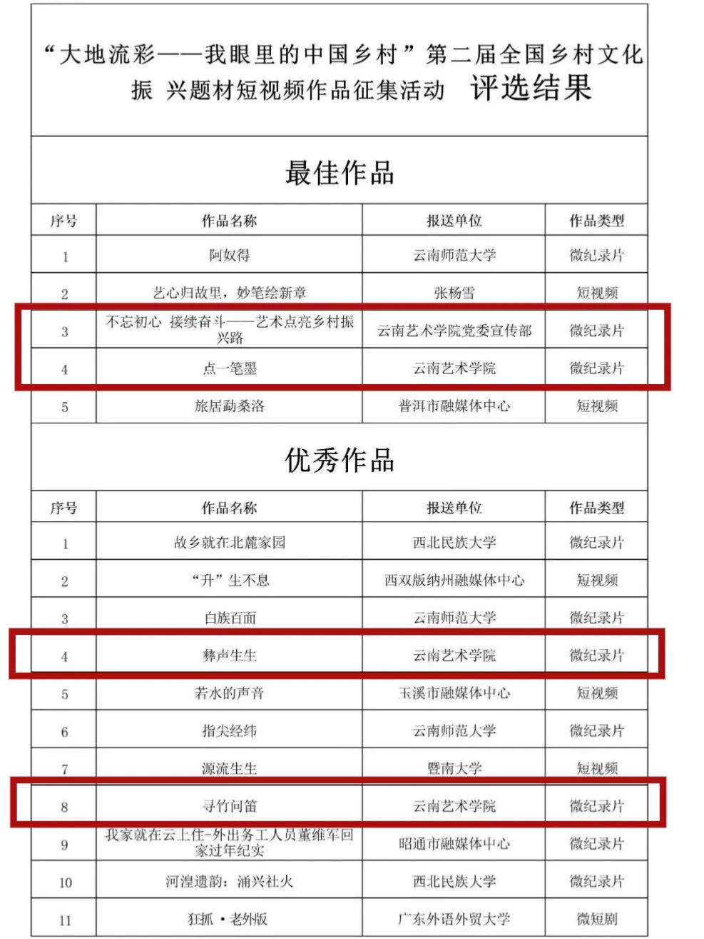在由云南省文学艺术界联合会、云南广播电视台主办,云南省电视艺术家协会、云南省电影家协会承办的“大地流彩——我眼里的中国乡村”第二届全国乡村文化振兴题材短视频作品征集活动中,云南艺术学院共7部作品获奖。其中,《不忘初心 接续奋斗——艺术点亮乡村振兴路》《点一笔墨》获“最佳作品”。