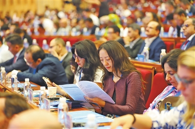 嘉宾在2025“一带一路”媒体合作论坛主论坛上翻阅资料。 |