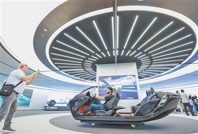 9月14日,采访团成员在比亚迪西安研发中心展厅内体验模拟驾驶系统。 |