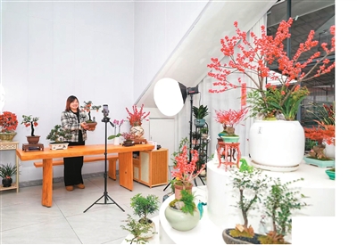 湖南省浏阳市柏加镇花农李贝贝在自己搭建的直播间推介盆景。