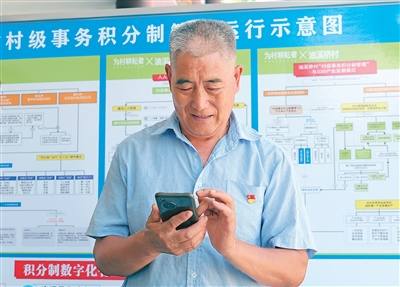 湖南省娄底市新化县油溪桥村村民正在用手机查看自己家的积分。