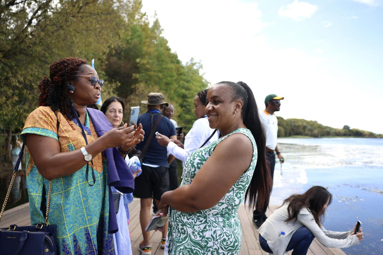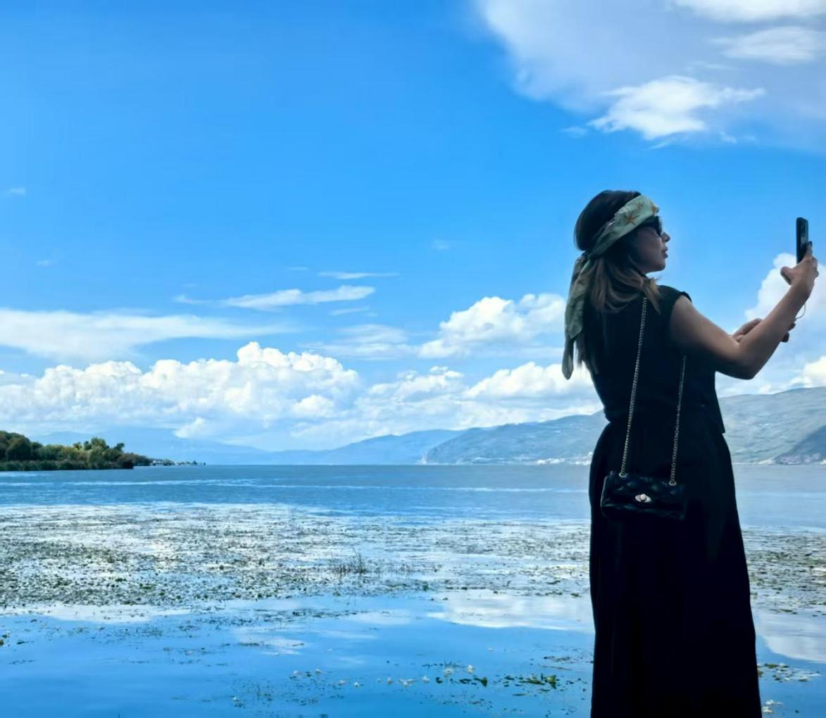 图为:9月21日,2025“一带一路”媒体合作论坛中外媒体联合采访团成员来到大理洱海生态廊道,一位外媒嘉宾拍照留念。