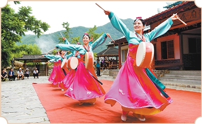 丹东市宽甸满族自治县下露河朝鲜族乡三道河朝鲜族民俗村的小鼓舞表演。吴 琼摄