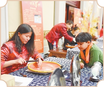 在平壤“欢乐春节”活动中,非遗传承人(左一)现场展示瓷雕。杨佳斌摄