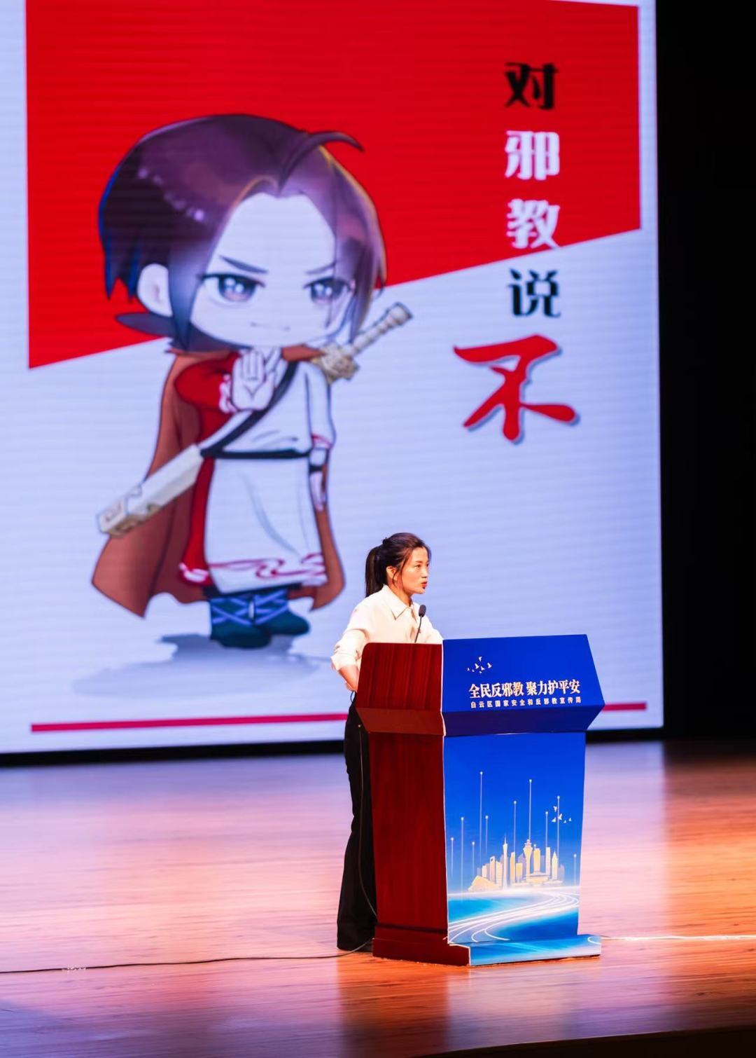 活动现场,2024年白云区反邪教宣传集锦视频《向光而行》直观呈现基层反邪工作者深入社区、校园、企业开展宣传的鲜活实践,展现白云区近年来在反邪领域的扎实成效与社会共治成果;白云政法原创反邪RAP《太邪门》则以年轻化、潮流化的表达形式,用朗朗上口的歌词揭露邪教歪理邪说的虚伪本质,让反邪宣传更接地气、更入人心,瞬间点燃现场氛围。