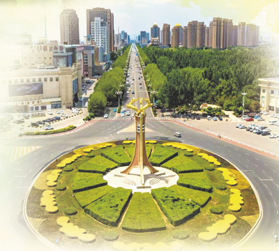 位于包头市中心的“三鹿腾飞”雕塑,小丽花在雕塑周围灿烂绽放。 |