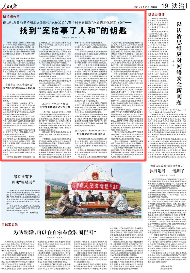 近日,记者赴安徽、上海、重庆三地采访调研。在安徽安庆,一场遗产纠纷,法官巧讲“六尺巷”典故让兄妹5人握手言和;在上海金山,一起险些激化的邻里建房纠纷,凭借派出所、司法所、律师事务所联动的“三所联动”机制成功化解;在重庆武隆,一桩长达10年的土地边界争议,用科技赋能确权存证,从源头平息……这些来自基层一线的生动实践,正是各地坚持和发展新时代“枫桥经验”,因地制宜、探索创新“矛盾纠纷化解工作法”的鲜活注脚。