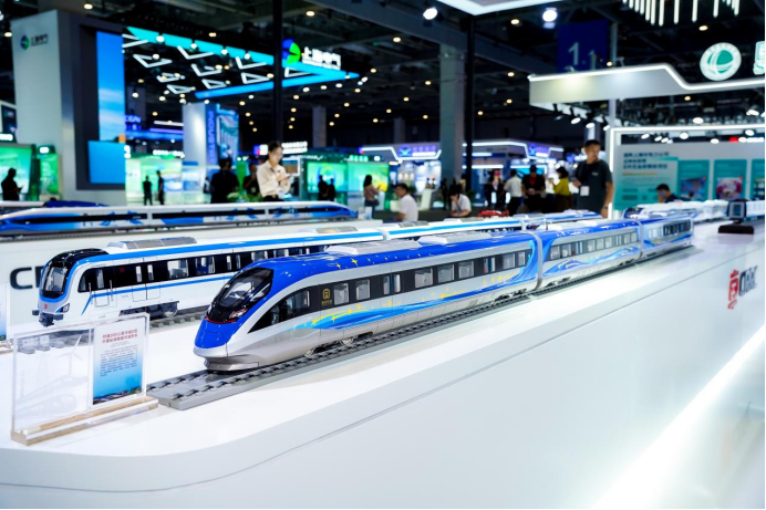 一旁的CR450动车组样车更显硬核,突破减阻降耗、全要素轻量化等多项关键技术,运营速度、运行能耗等主要指标均达国际领先水平。更令人瞩目的是三款氢能源动力列车:CINOVA H₂新能源智能城际动车组、氢能市域列车和“氢春号”氢能有轨电车,均以零碳排放、超长续航为核心优势,其中“氢春号”兼具科技感与怀旧风情,已成为城市交通的新名片。