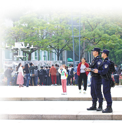 广东深圳民警在人流密集场所使用警用无人机开展巡逻。