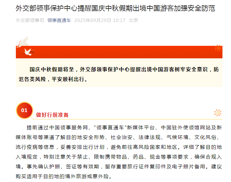国庆中秋假期将至,外交部领事保护中心提醒出境中国游客树牢安全意识,防范各类风险,平安顺利出行。
