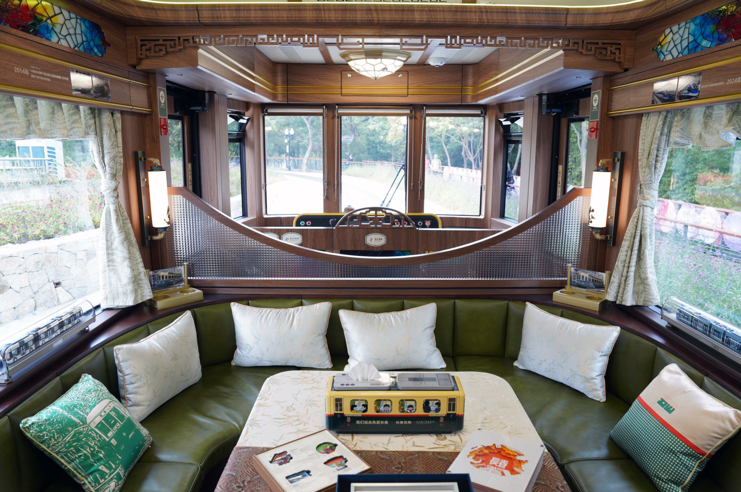 步入车厢内,回纹雕栏、玻璃彩饰、弧形穹顶……多处装饰融入传统元素,座椅和地板则体现长春市“市花”君子兰的墨绿色元素,并在部分地方放置了复古壁灯与留声机。