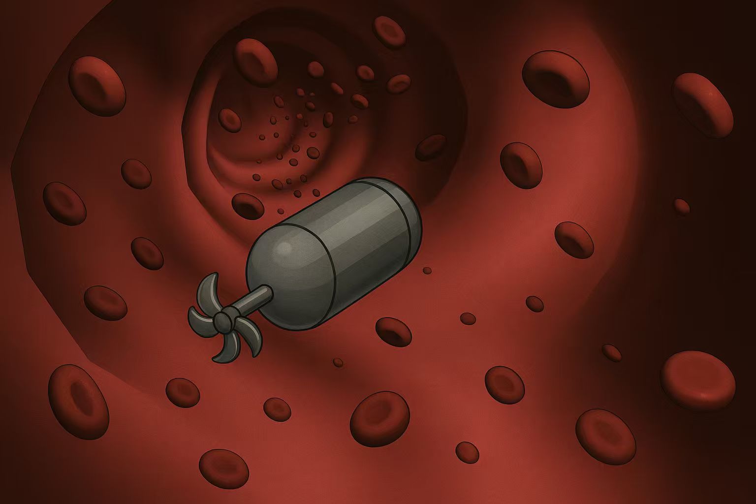 螺旋桨推进的微型机器人在血管里工作的设想画面