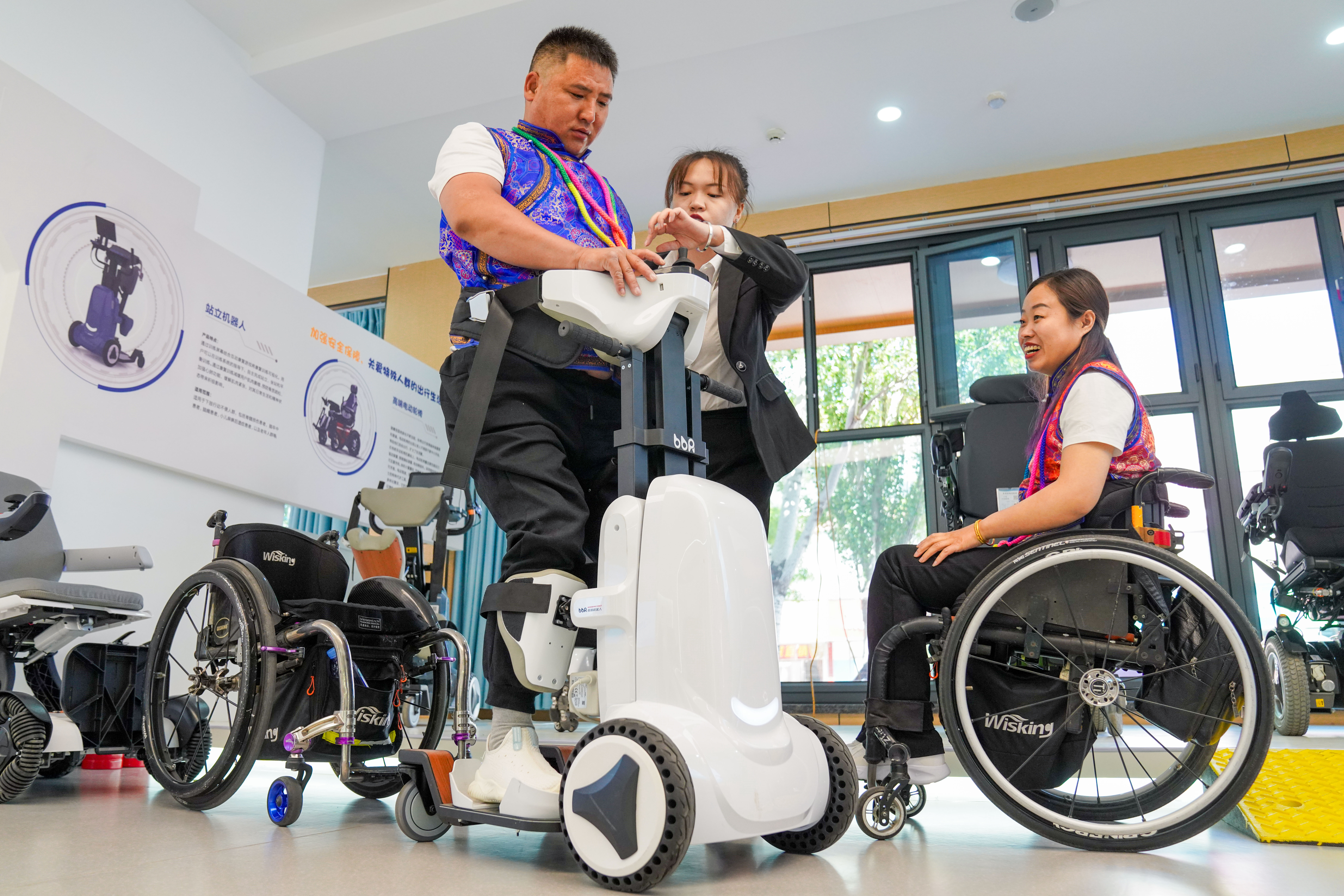内蒙古呼和浩特市,一名残疾人在站立机器人的辅助下直立。王晓博摄(影像中国)