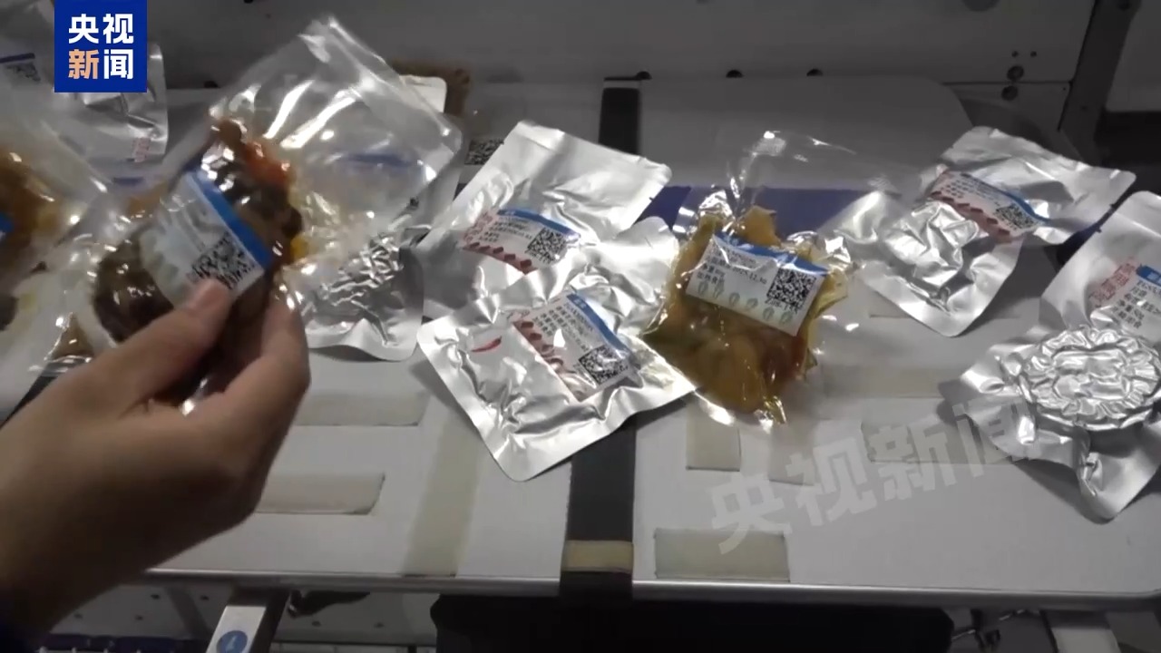 航天员 王杰:有美味白灵菇、油焖笋、豆腐卷、肉末香菇、虾球马蹄。还有一些副食,素米粉、太空香粽、桂花芝士年糕。