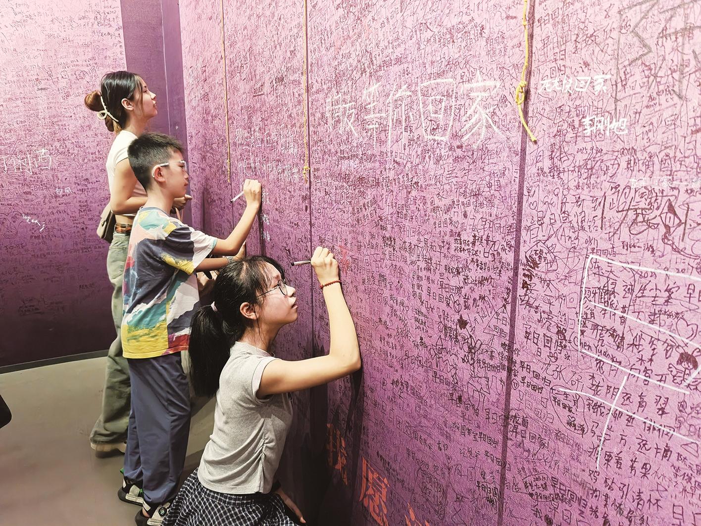 中秋节当天,返乡过节的漳州人王晓岚特意带着两个孩子前来观展,在签名墙上,王晓岚引导孩子们写下了“早日回家”和各自名字。“我特意选择在团圆的节日带孩子来感受文物回归的意义,这些流失文物就像远游的家人,它们的归来让我们更懂得团圆的价值。”王晓岚说。
