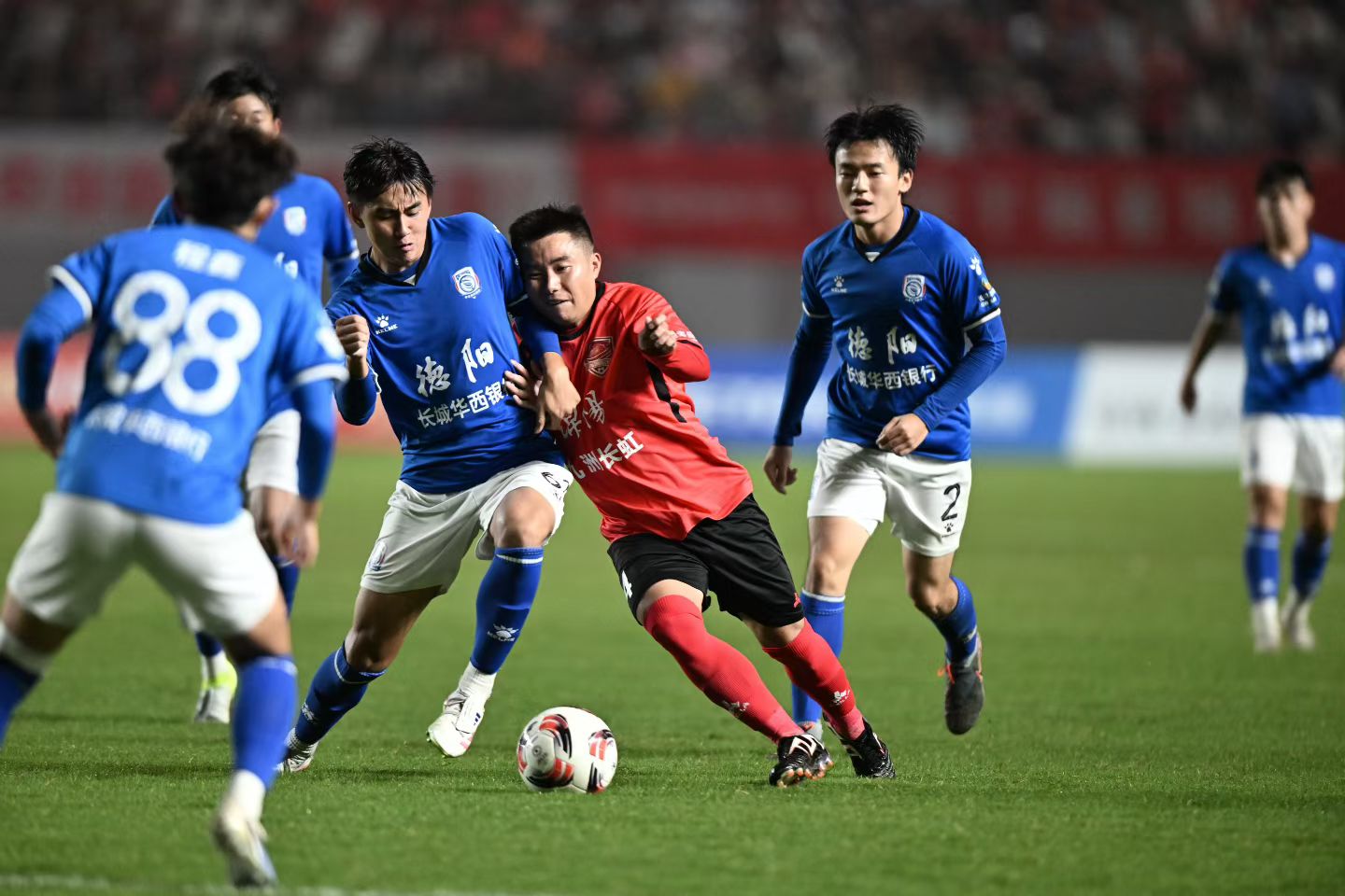 绵阳队(红)主场迎战德阳队比赛中。张涛平摄