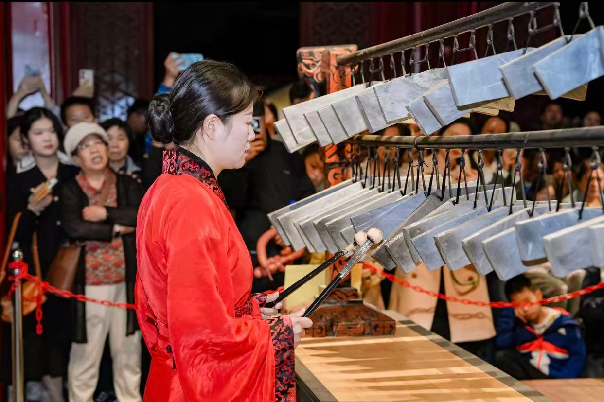 白天的博物馆,馆方贴心提供定时免费讲解服务,讲解员将带领观众深入了解古钟的历史渊源、铸造工艺与文化寓意,让文物背后的故事触手可及。同时,庭院内穿插进行民乐、舞蹈展演,悠扬的民乐演奏与优美的古典舞蹈轮番呈现,一曲曲经典民乐曲目在古建间流转,观众驻足聆听、拍照记录,沉浸式感受民乐魅力,增添了别样的传统文化氛围。