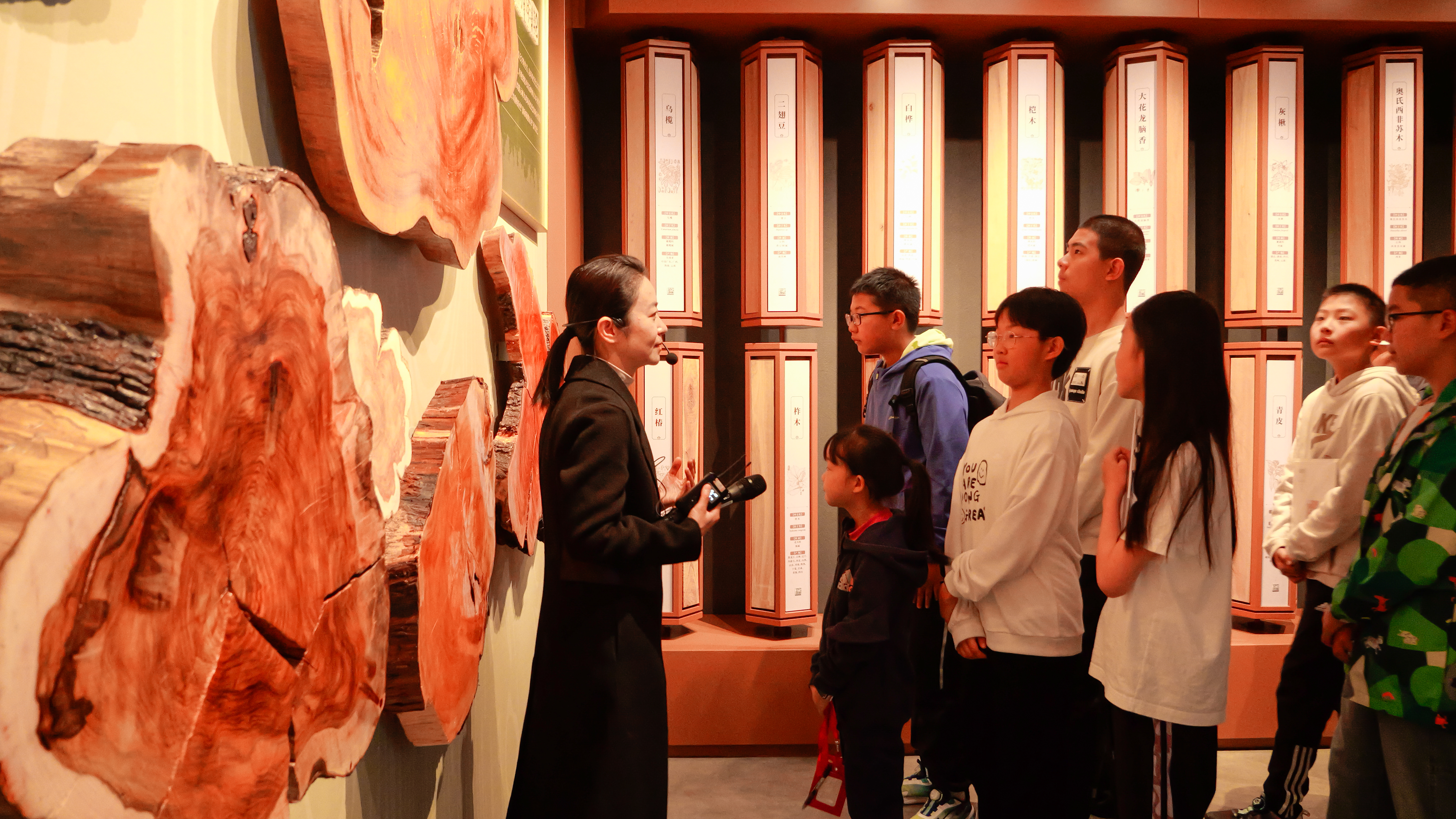 在专业讲解员引导下,研学团开启了木竹世界的探索之旅。木世界展厅里,“滇材大用”展区的“三松一杉”等云南特色经济树种率先吸引目光,同学们亲手掂量极轻的“轻木”与极重的“蚬木”,直观感知木材密度的巨大差异;记录地球气候变迁的“年轮展墙”、见证数千年历史的“剑川海门口遗址饱水木构件”,以及承载亿万年时光的“木化石”,让大家深刻读懂木材作为“自然档案”的科学价值。