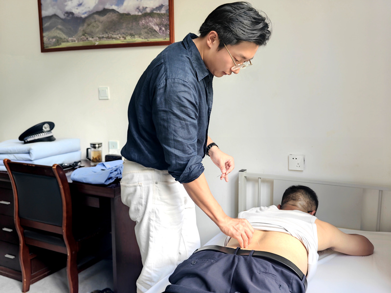 “十几分钟就摆脱了几年的关节痛,腰椎也不酸了!”刚做完针灸的民警马德飞连连致谢。从银针刺入穴位到手法推拿舒缓肌肉,席润东用精湛医术为多位民辅警解除了长期困扰。诊疗间隙,他还结合典型病例,为全体民辅警讲解中医针灸基础理论,分享高海拔环境下预防腰肌劳损、关节炎的日常护理方法,手把手教大家简单的穴位按摩技巧,让健康防护知识扎根警营。