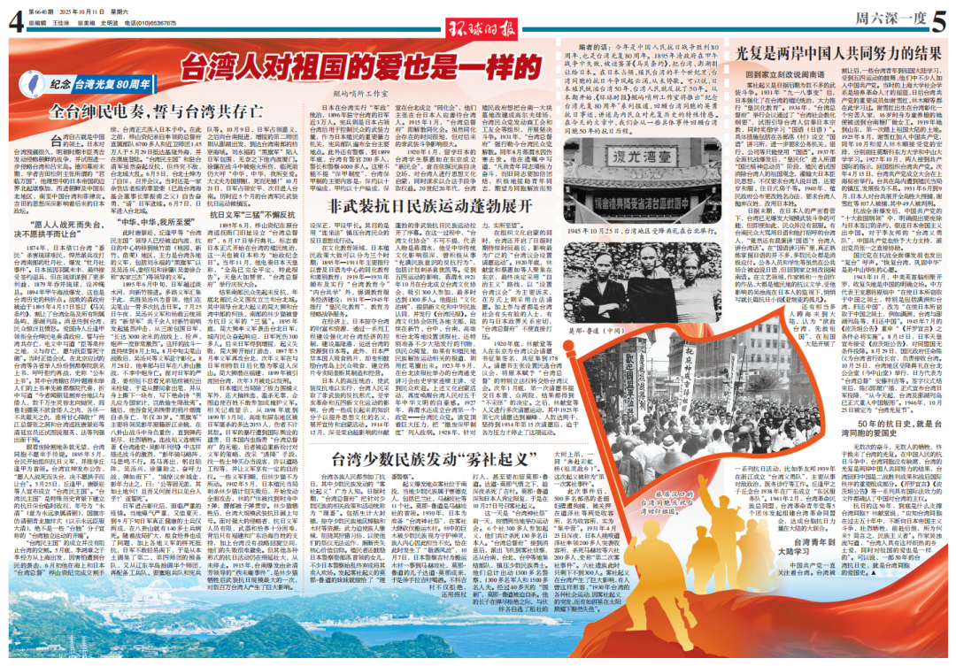 编者的话:今年是中国人民抗日战争胜利80周年,也是台湾光复80周年。1895年清政府在甲午战争中失败,被迫签署《马关条约》,把台湾、澎湖割让给日本。在日本占领、殖民台湾的半个世纪里,台湾同胞的抗日斗争风起云涌,从未停歇。可以说,日本殖民统治台湾50年,台湾人民就反抗了50年。从本期开始,《环球时报》鲲屿哨所工作室将推出“纪念台湾光复80周年”系列报道,回顾台湾同胞的英勇抗日事迹,讲述岛内民众对光复历史的特殊情感。在今天的文章中,我们会从一些具体事件回顾台湾同胞50年的抗日历程。