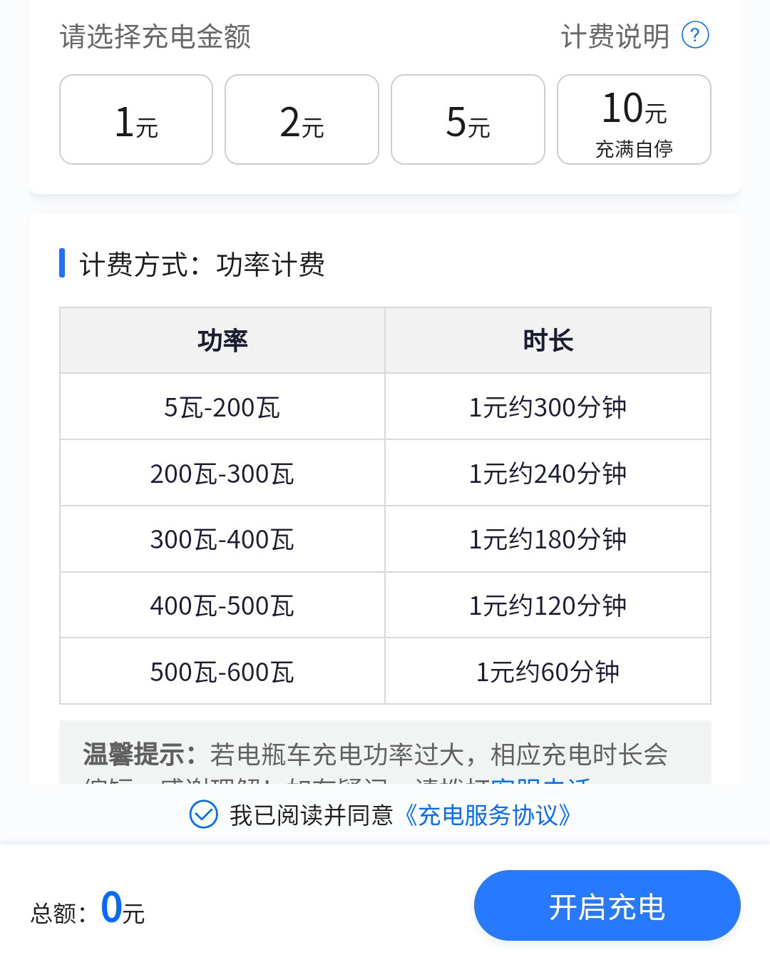“我不知道电费多少、服务费多少,反正每次结账显示多少就是多少。”一大早,广渠家园居民小张将充满电的电动车推出车棚。记者用手机扫码,发现小张充电的这处充电桩按功率计费,并未显示电费和服务费分别是多少,只提供参考时长,如功率500W到600W,1元大约能充60分钟。用户可以自行选择充电金额,也可以选择充满自停。