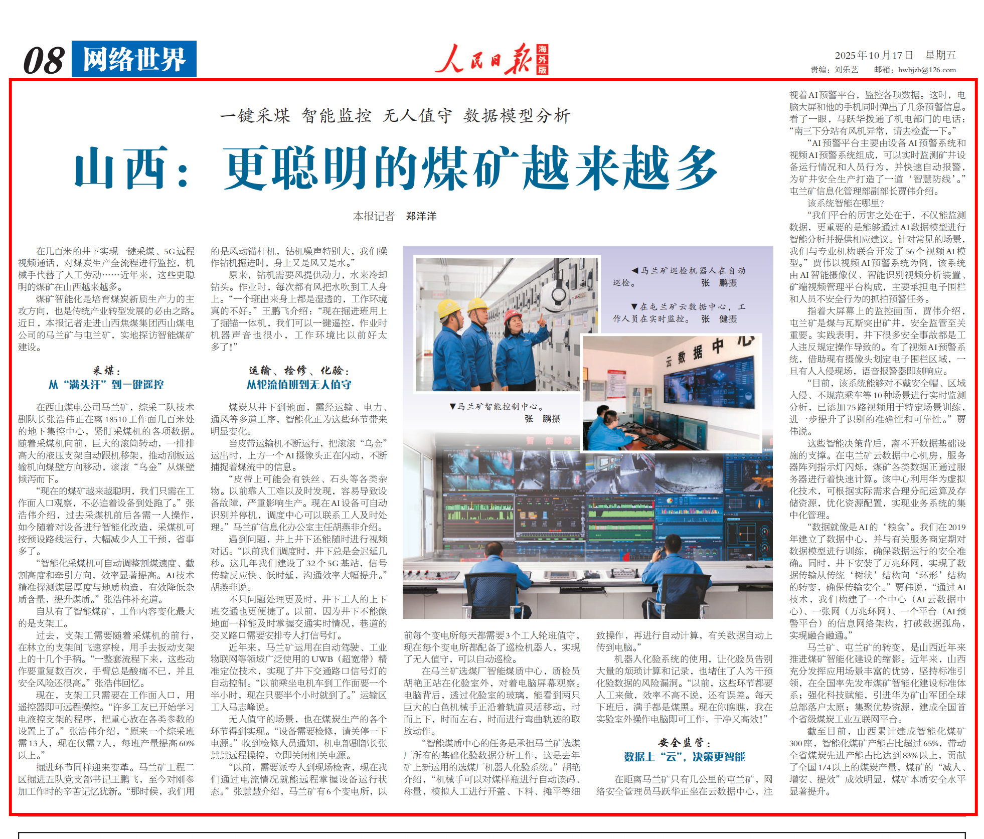 马兰矿、屯兰矿的转变,是山西近年来推进煤矿智能化建设的缩影。近年来,山西充分发挥应用场景丰富的优势,坚持标准引领,在全国率先发布煤矿智能化建设标准体系;强化科技赋能,引进华为矿山军团全球总部落户太原;集聚优势资源,建成全国首个省级煤炭工业互联网平台。