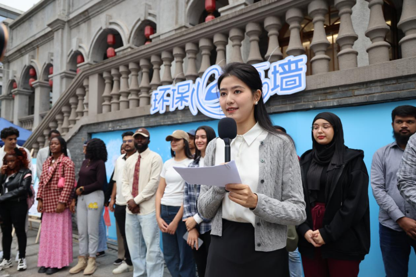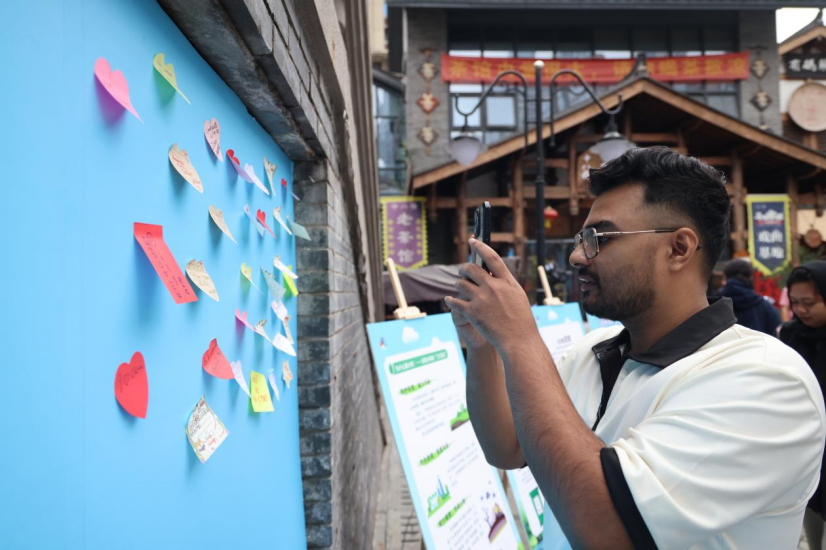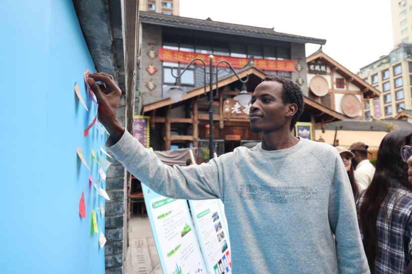 现场设置的“环保心愿墙”更是成为焦点,吸引众多参与者驻足——墙上贴满留学生用便签写下或画出的环保心愿,既有“我爱重庆!”“欢迎来摩洛哥!”“重庆真是一座干净的城市!”等真挚表达,也有“垃圾分类,从我做起”“低碳出行,绿色生活”“守护环境,人人有责”等行动宣言,传递着践行环保的决心。