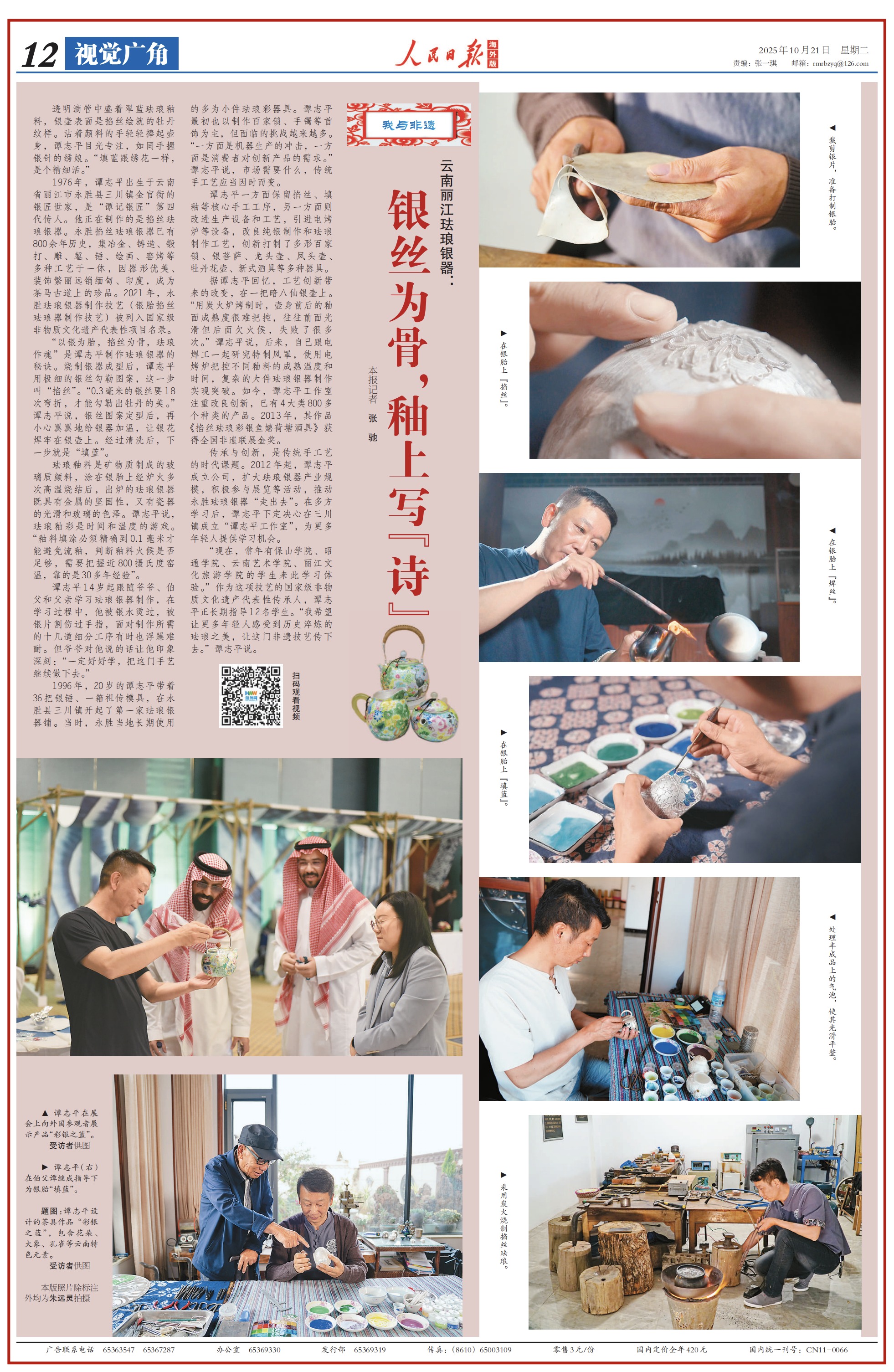 1976年,谭志平出生于云南省丽江市永胜县三川镇金官街的银匠世家,是“谭记银匠”第四代传人。他正在制作的是掐丝珐琅银器。永胜掐丝珐琅银器已有800余年历史,集冶金、铸造、锻打、雕、錾、锤、绘画、窑烤等多种工艺于一体,因器形优美、装饰繁丽远销缅甸、印度,成为茶马古道上的珍品。2021年,永胜珐琅银器制作技艺(银胎掐丝珐琅器制作技艺)被列入国家级非物质文化遗产代表性项目名录。