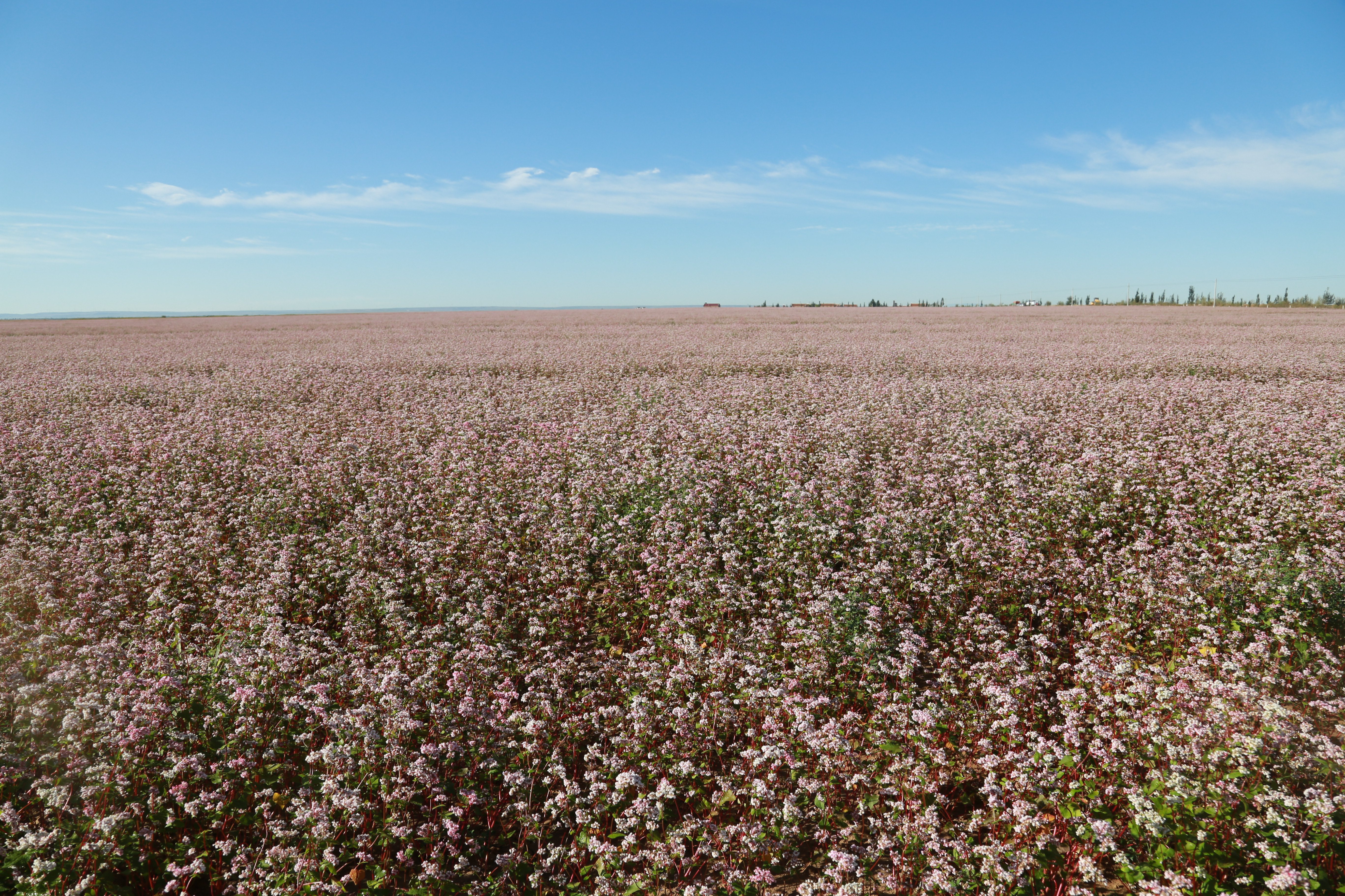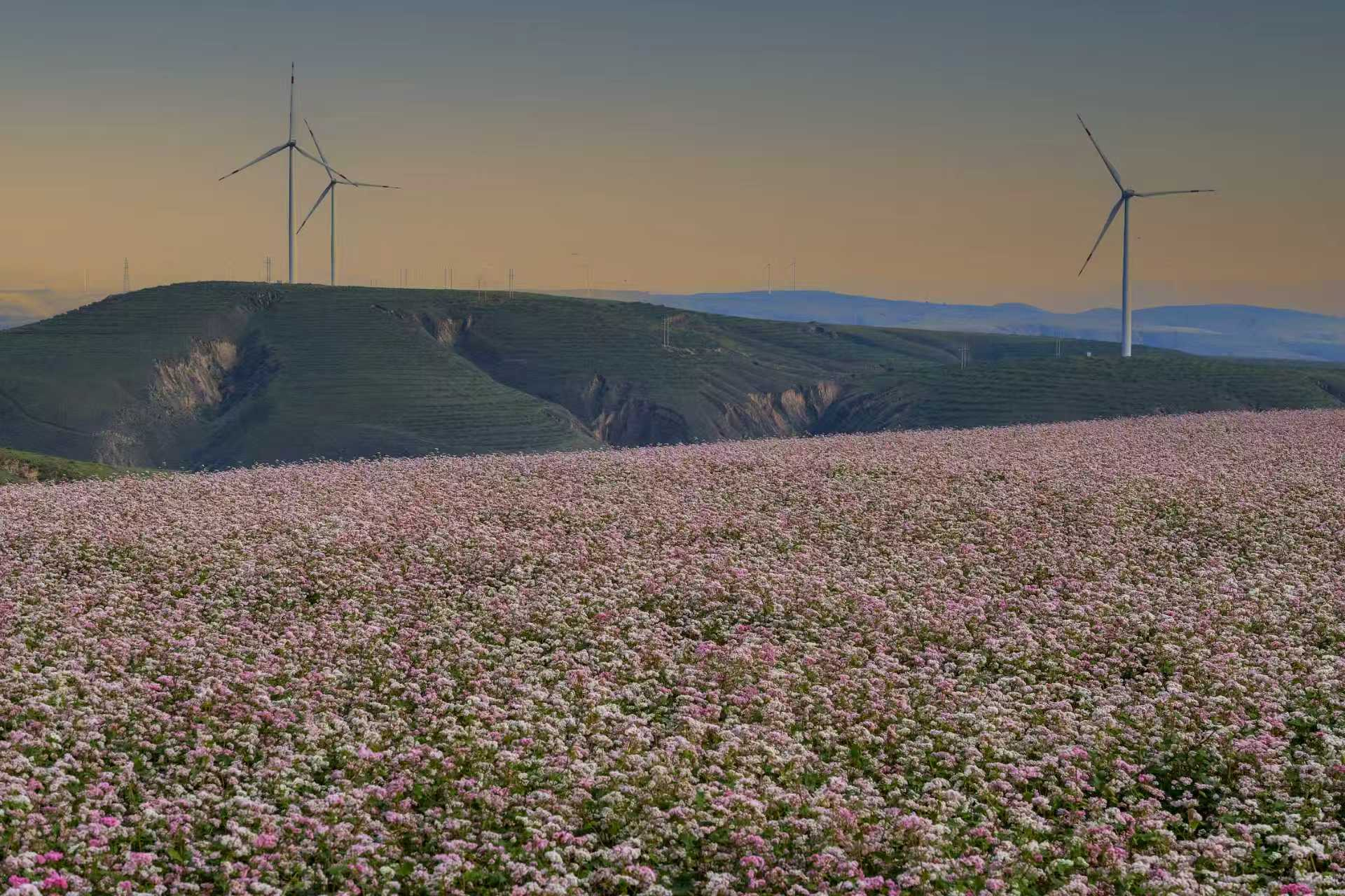 吴忠市同心县张家塬乡汪家塬村的荞麦和风电。张旭东摄
