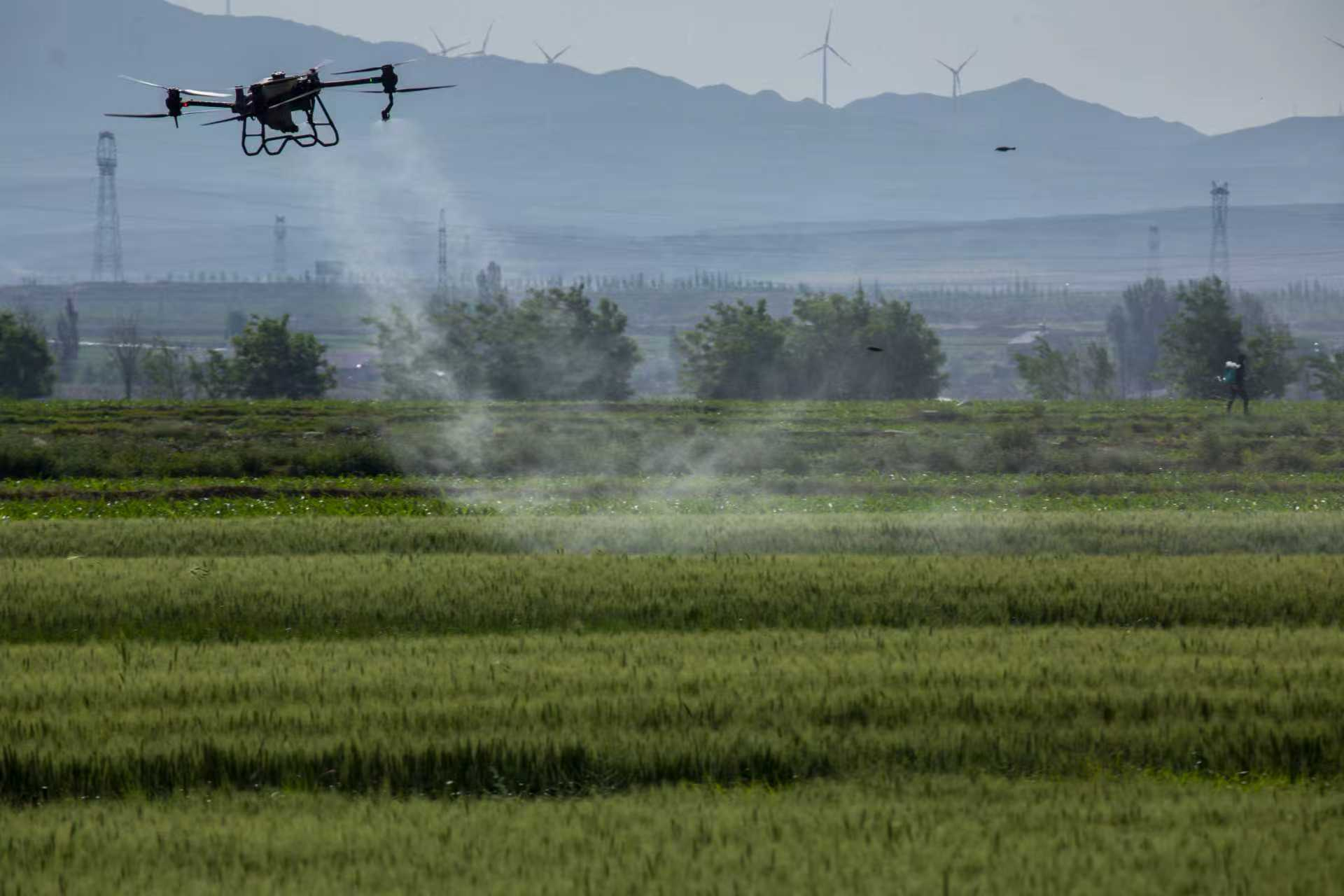 吴忠市同心县石狮开发区无人机施肥。海洋摄