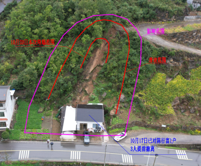 10月17日10时许,巫溪县白鹿镇驻守地质工程师陈德龙、汪金才在开展雨中巡查时,发现燕子村3组村民陈行富家屋后岩质斜坡出现变形迹象,经专业分析研判可能会出现滑坡,随即会同白鹿镇政府人员组织该户村民撤离,于17日11时许撤离完毕。10月20日12时30分许,陈行富家屋后斜坡出现局部滑塌,体积约20立方米,造成下方2间房屋受损,因巡查到位、提前撤离,未造成人员伤亡。