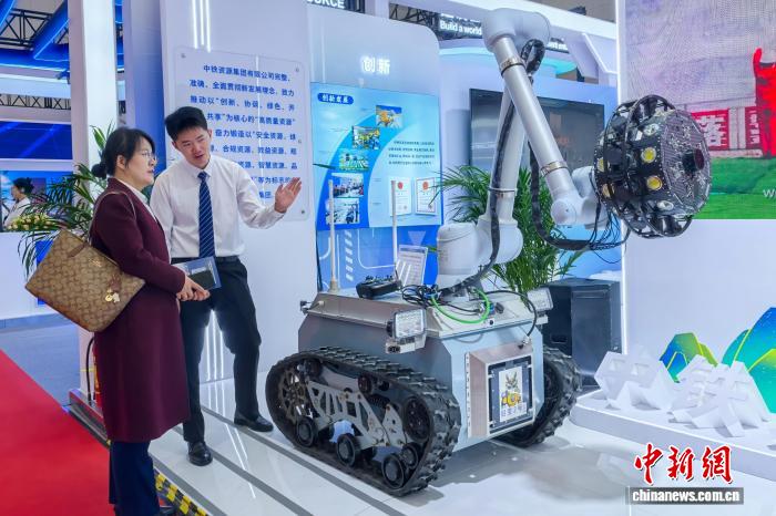 10月23日,天津,与会嘉宾参观防洪隧(涵)洞智能巡检机器人。当日,2025第二十七届中国国际矿业大会在天津梅江会展中心举行。大会以“互融互通,共建共享”为主题,设置了智能矿山(智能制造)、地质调查/矿业勘探设备、重型机械设备及配套零配件等多个展区,涵盖矿业全产业链条。中新社记者 佟郁 摄