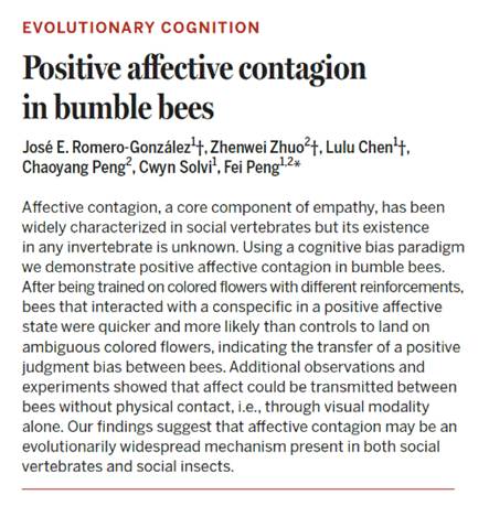 当时,科学界首次观测到熊蜂在获得意外奖励时,会表现出类似“积极情绪”的行为特征,反应速度加快、决策更趋向冒险。这一结果打破了人们对“昆虫心智”的传统印象,也让彭飞萌生了一个大胆的科学假设,如果单只熊蜂能产生“积极情绪”,这种状态是否也能在熊蜂个体之间传播?