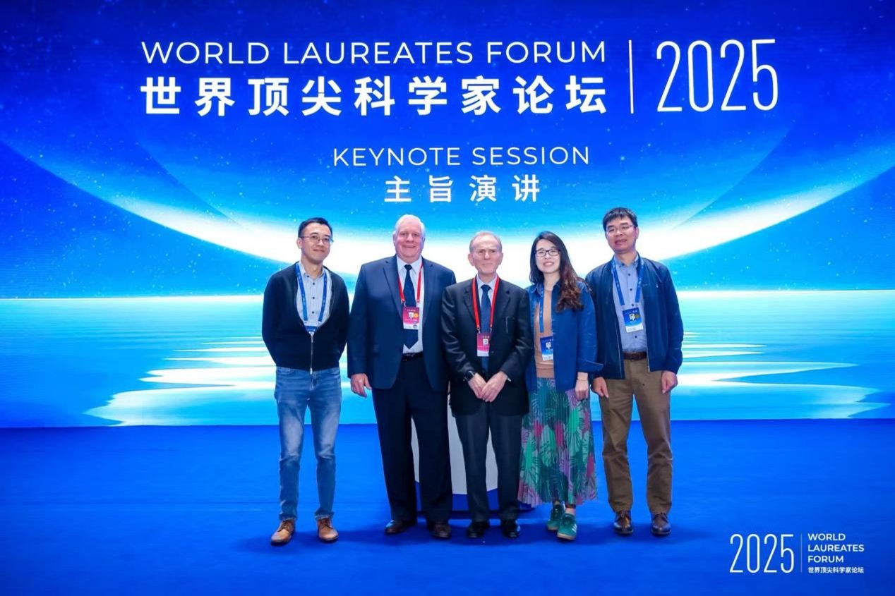 埃默尔(左二)与学生凌亚鼎(左一)在2025顶科论坛上合照。世界顶尖科学家论坛供图