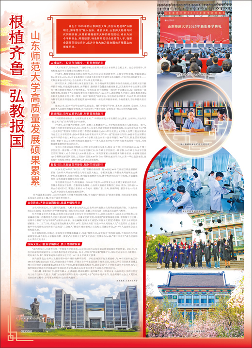 诞生于1950年的山东师范大学,自创办起便将“弘德明志、博学笃行”融入血脉。建校以来,山东师大始终与时代同频共振,从最初播撒教育火种的师范院校,成长为如今学科齐全、师资雄厚、特色鲜明的综合性师范大学,稳居全国师范院校前列,成为齐鲁大地乃至全国教育版图上的璀璨明珠。